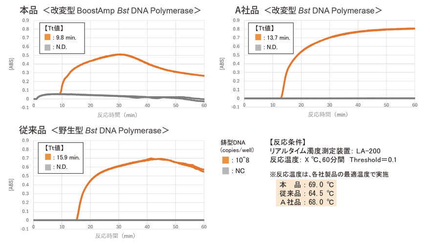 【結果】 本品(BoostAmp Bst DNA Polymerase)は、従来品(野生型 Bst)およびA社品(改変型 Bst)と比較して、増幅曲線の立ち上がりが早く、微量な鋳型DNAにおいても増幅が確認されました。