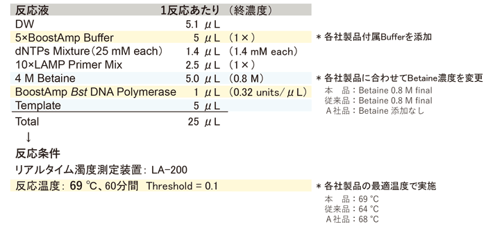 本品(BoostAmp Bst DNA Polymerase)と従来品(野生型 Bst DNA Polymerase、 Code No. 311-07481)およびA社品(改変型 Bst DNA Polymerase)に、各社酵素反応バッファー、プライマーミックス、dNTPs、鋳型DNAを混合した反応液を調製し、 濁度測定装置で核酸増幅を行い、Threshold time値(閾値到達時間)を比較しました。