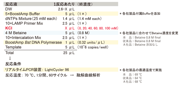 【結果】 KClの最終濃度を 20 mM とした反応条件では、本品(BoostAmp Bst DNA Polymerase)は、KClを添加していない条件と同等の増幅効率を示しました。
