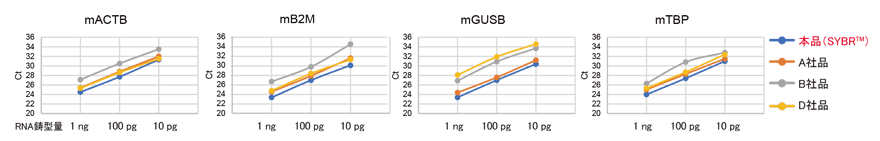 結果 各遺伝子の各鋳型量において、本品は最も低いCt値を示し、高い増幅効率が確認された。また、各鋳型量において高い直線性が得られたことから、鋳型濃度が低い条件でも安定した増幅が可能であることが確認された。