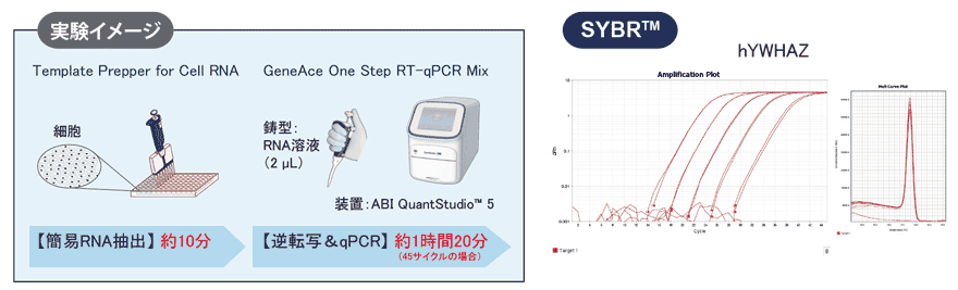 結果 本品と簡易RNA抽出試薬「Template Prepper for Cell RNA」を組み合わせることで、RNA抽出からqPCRまでの工程を大幅短縮することができた。