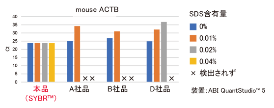 マウスから抽出したTotal RNA(100 pg)をテンプレートとし、ドデシル硫酸ナトリウム(SDS)の最終濃度が下記濃度となるように添加し、1 step RT-qPCRを行いCt値より増幅効率を比較した。PCRサイクル条件は、各社の推奨プロトコールに従って実施した。
