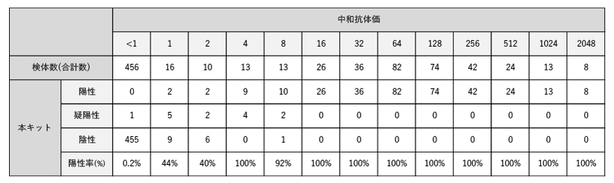 以下の表は多数の血清試料の抗体価を本ELISAキットと中和法で測定し比較した結果です。