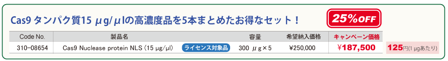 ・ 制限酵素Combination Series につきまして、2025年4月1日からの価格改定に伴い、Combination Series の対象製品から修飾酵素をなくす仕様変更を実施させていただきました。一部の制限酵素と修飾酵素はキャンペーン対象外です。