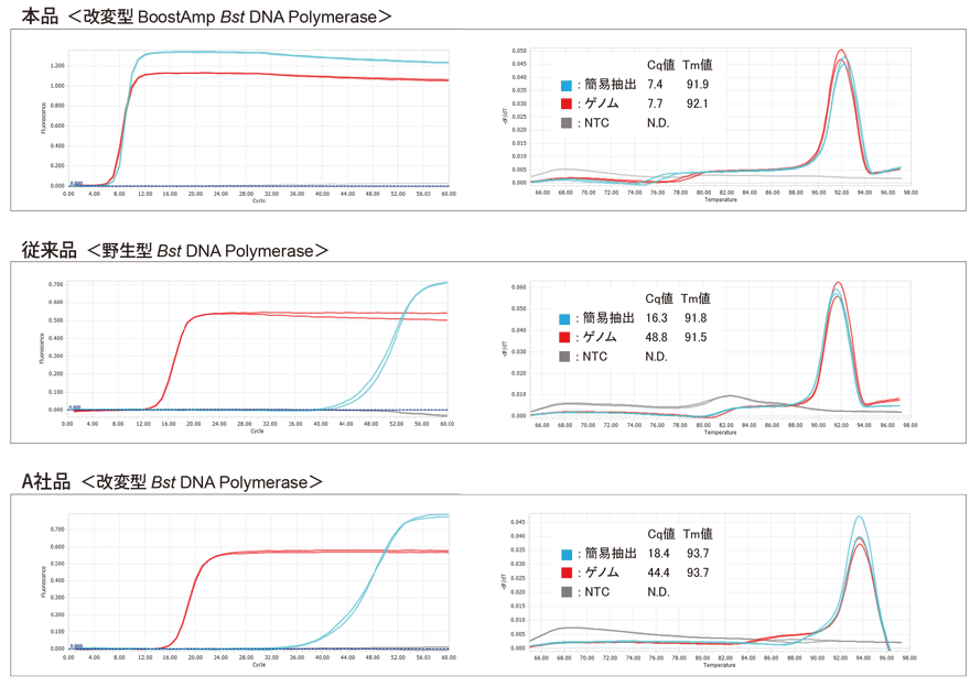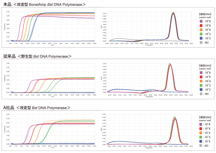 【結果】 本品(BoostAmp Bst DNA Polymerase)は、従来品(野生型 Bst)およびA社品(改変型 Bst)と比較して、増幅曲線の立ち上がりが早く、微量な鋳型DNAにおいても増幅が確認されました。