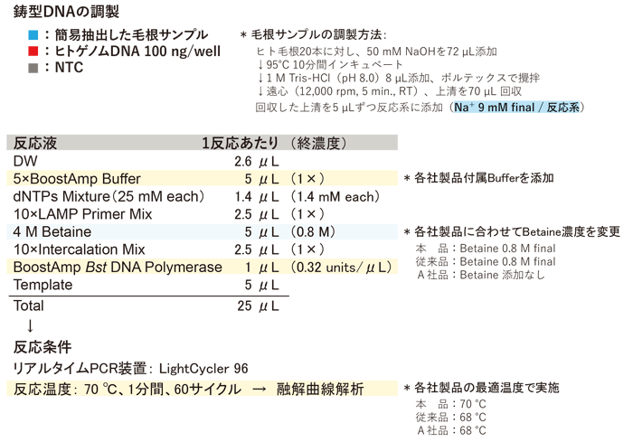 アルカリ溶液で溶解したヒト毛根の上清を鋳型に使用しました(反応系中の Na+ 最終濃度:9 mM)。