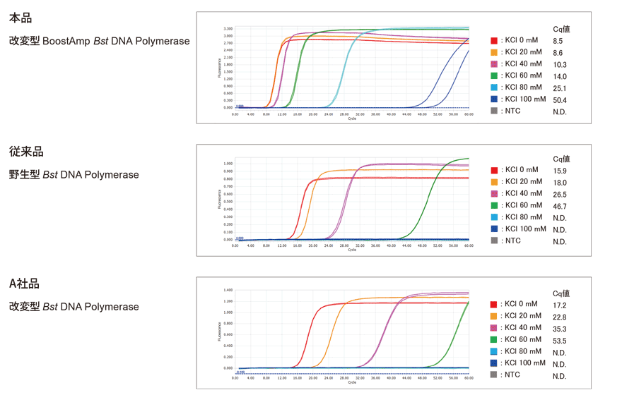 さらに、KClの最終濃度が 80 mM 以上という厳しい条件下では、他社品では増幅が確認されなかったのに対し、本品では増幅が認められました。