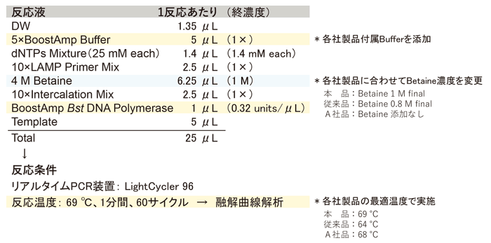 本品(BoostAmp Bst DNA Polymerase)と従来品(野生型 Bst DNA Polymerase、 Code No. 311-07481)およびA社品(改変型 Bst DNA Polymerase)に、10×Intercalation Mix(別売、Code No. 315-09721)、各社酵素反応バッファー、プライマーミックス、 dNTPs、鋳型DNAを混合した反応液を調製し、リアルタイムPCR装置で核酸増幅を行い、蛍光検出しました。