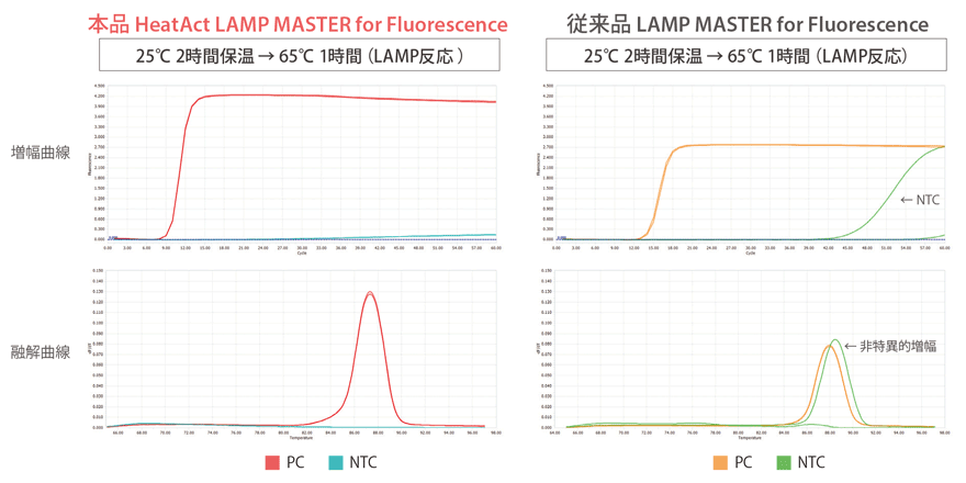 反応特異性について評価するため、陽性コントロールプラスミドを添加したLAMP反応液(PC)および鋳型なしのLAMP反応液(NTC)を調製し、25℃で2時間保温した後、65℃で1時間反応させた。本品(HeatAct LAMP Master for Fluorescence)および従来品(LAMP Master for Fluorescence)について同一条件下で比較した。測定にはLight Cycler® 96を使用した。