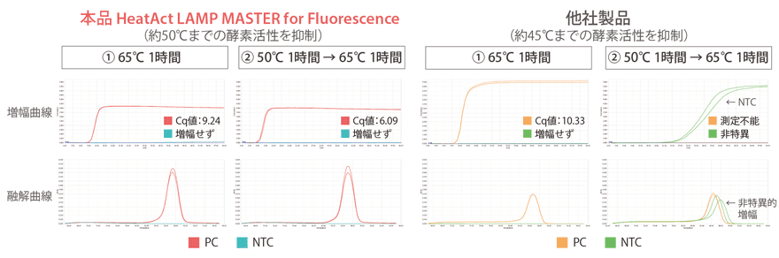 陽性コントロールプラスミドを添加したLAMP反応液(PC)および鋳型なしのLAMP反応液(NTC)を、以下の反応条件でLAMP反応を行った。アプタマーを含む他社製品(約45℃までの酵素活性を抑制)と本品(約50℃までの酵素活性を抑制)とで比較した。
