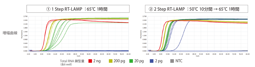 Total RNAを鋳型とし、AMV Reverse Transcriptase を添加した以下の反応液組成にて RT-LAMP を実施した。 65℃で 1 時間反応させる 1 Step 条件と、逆転写酵素の至適温度に近い 50℃で10 分間逆転写反応を行った後、65℃で 1 時間反応させる 2 Step 条件を設定し、それぞれ 6 well で比較した。