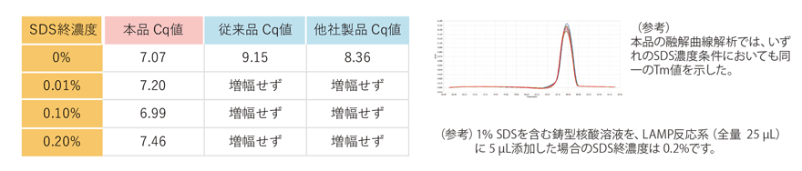 結果 本品は SDS に対して高い耐性を示し、SDS終濃度0.2%存在下においても増幅が認められました。 一方、従来品および他社製品では、SDS終濃度0.01%の条件においても増幅は認められませんでした。 本品は、SDS含有核酸抽出試薬から得られた粗抽出核酸を鋳型として使用できます。