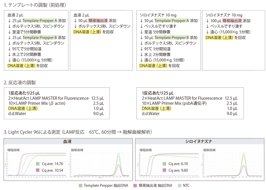 結果 本品を用いることで、SDSを含む簡易抽出液で調製したDNAを鋳型とした場合においても、血液および植物試料のいずれからもLAMP反応による増幅が確認された。